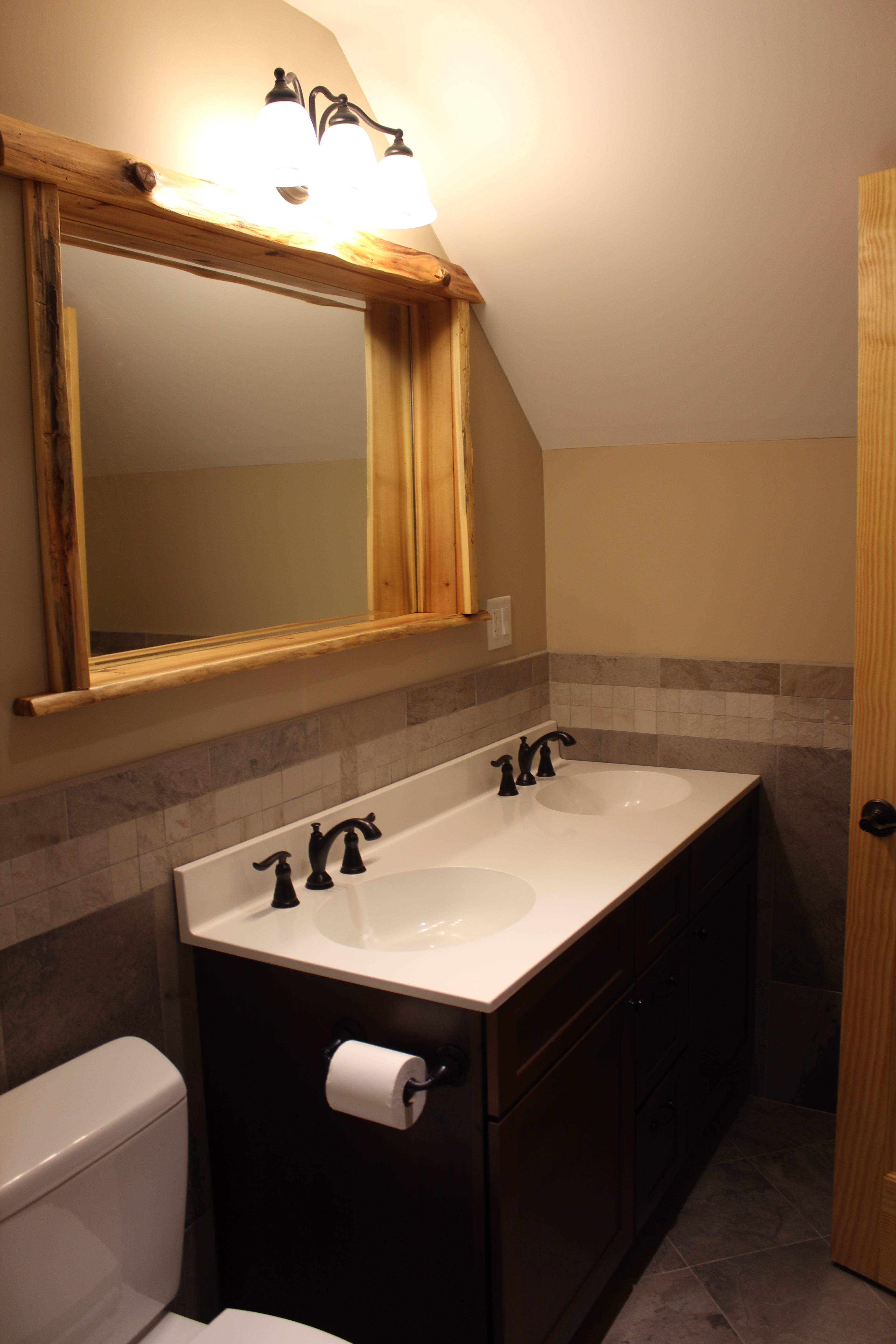 Large loft space with a Queen, Twin, and Twin bunk bed. This room is large and cozy and has a private bathroom with two sinks.